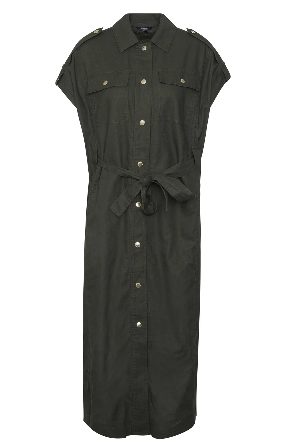 Thoughtfully designed, its structured epaulettes and cinched waist belt subtly enhance the silhouette, while chest pockets with branded studs add an understated practicality. The lightweight linen-blend fabric delivers breathability, ideal for leisurely afternoons or al fresco occasions. Finished with a discreet silicone ID badge at the back neck, it strikes a harmonious balance between classic style and modern refinement. A true staple for sunny days, this dress promises comfort and sophistication with every wear.