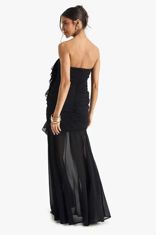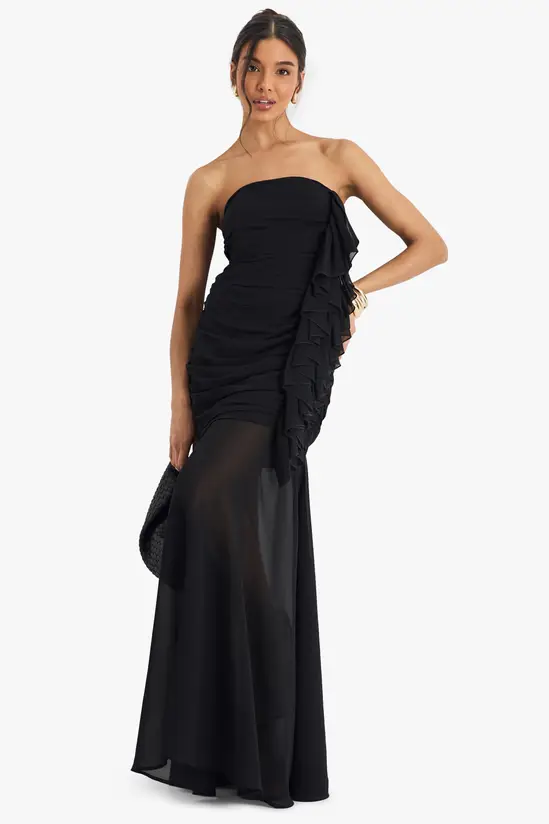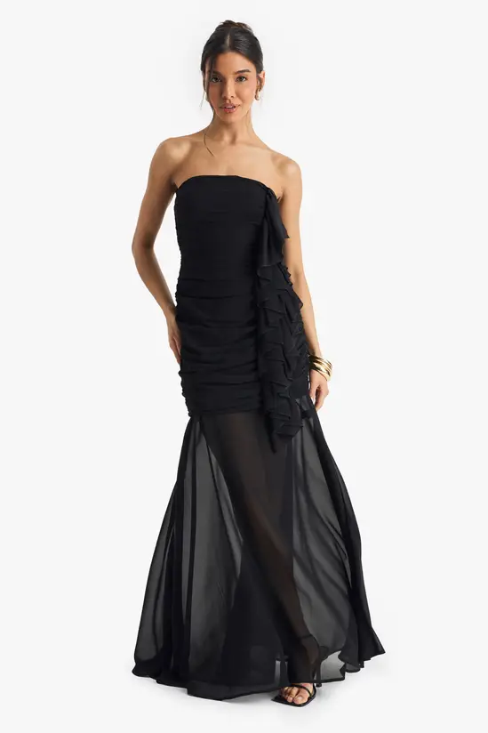 Make an unforgettable entrance in this show-stopping chiffon maxi dress. The bandeau neckline frames your décolletage beautifully whilst the expertly ruched bodice creates a flattering silhouette that hugs in all the right places. The sheer overlay skirt adds a tantalising glimpse of leg as you move, perfect for those special nights out. Style with strappy heels and statement gold jewellery as seen on our model for a look that commands attention at any club or cocktail bar. For cooler evenings, drape a tailored blazer over your shoulders for added sophistication. This dealioxperience dress transitions effortlessly from drinks with the girls to dancing until dawn – a versatile must-have for your night-out wardrobe.