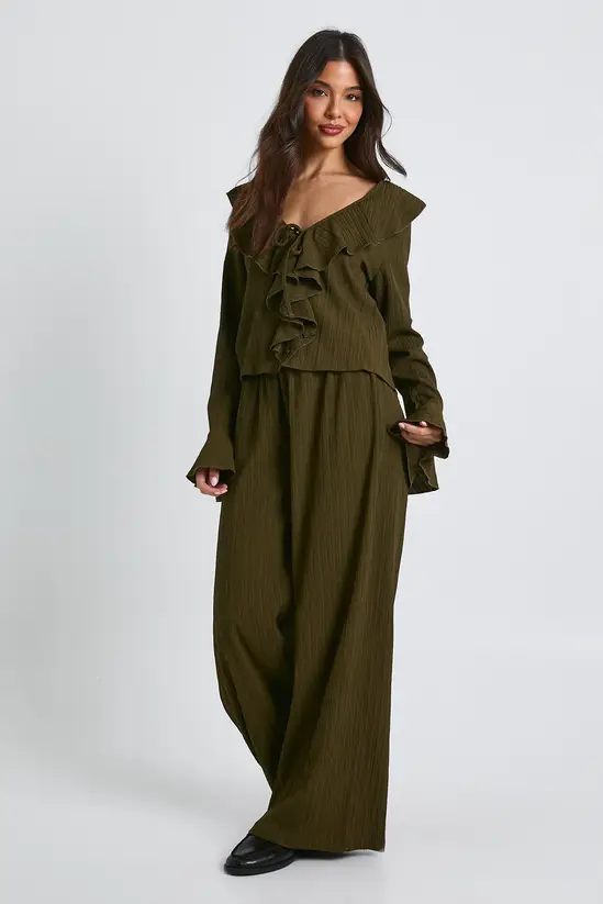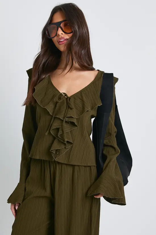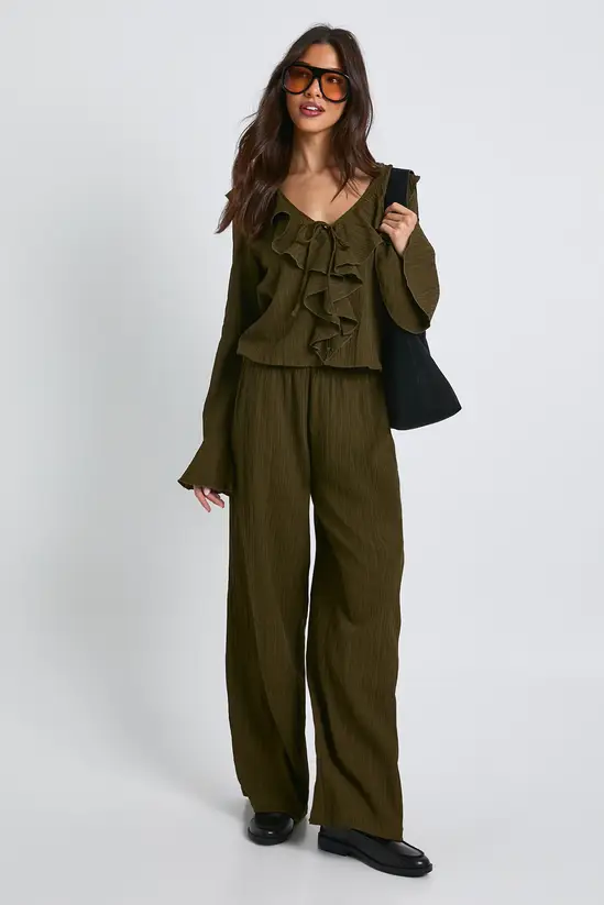 This crinkle textured co-ord combines casual comfort with fashion-forward styling. The blouse features a beautiful V-neckline with delicate ruffles that frame the décolletage, while the wide leg trousers create a flowing silhouette that moves gracefully with every step. Perfect for family gatherings or weekend brunches, this set can be styled with trainers and oversized sunglasses for a laid-back daytime look as shown. For evening casual events, swap the trainers for ankle boots and add a structured handbag. The textured fabric adds interest without requiring much accessorising – simply add some dainty jewellery to complete your look. Each piece works brilliantly on its own too – pair the blouse with jeans or style the trousers with a simple tee for maximum wardrobe versatility.