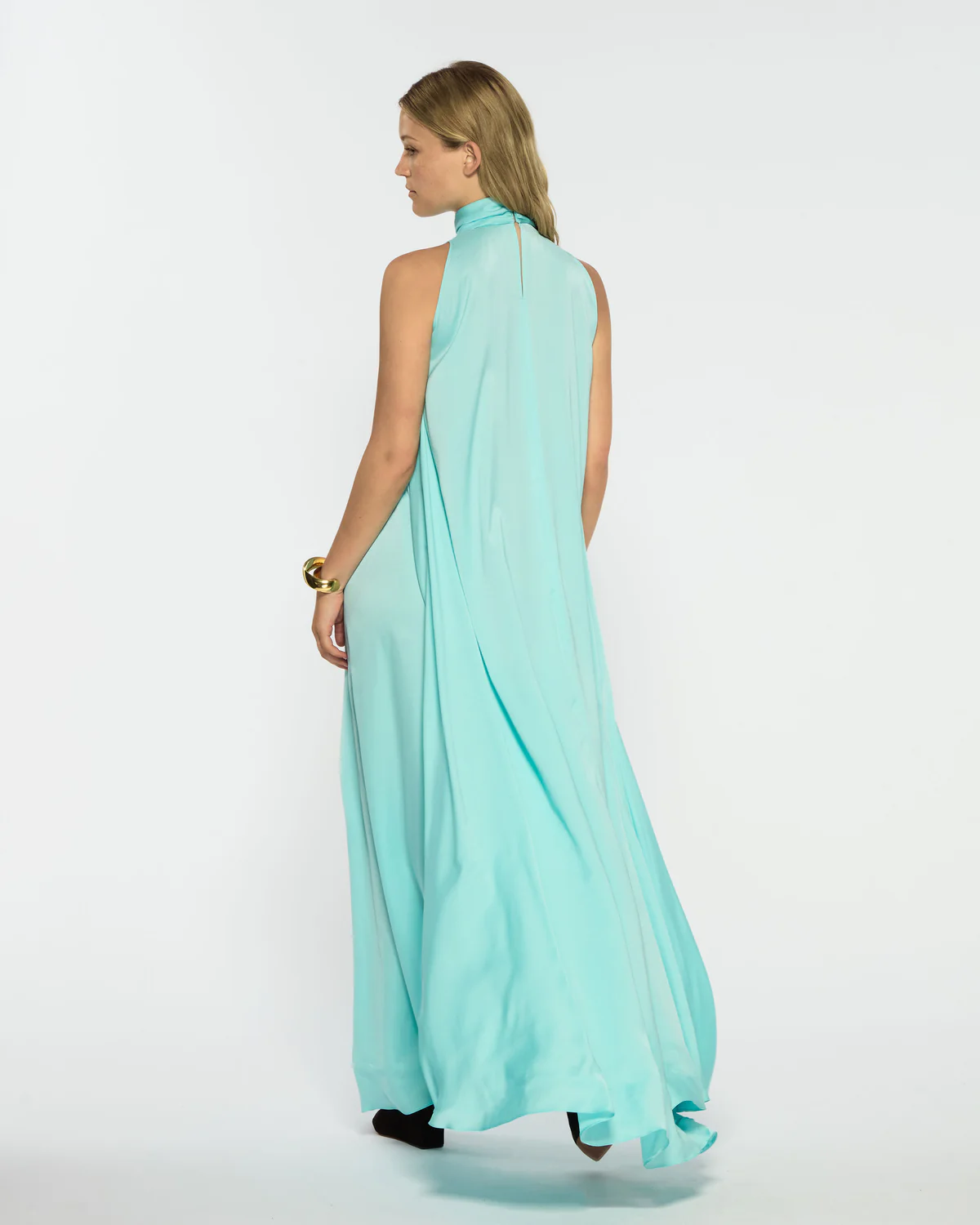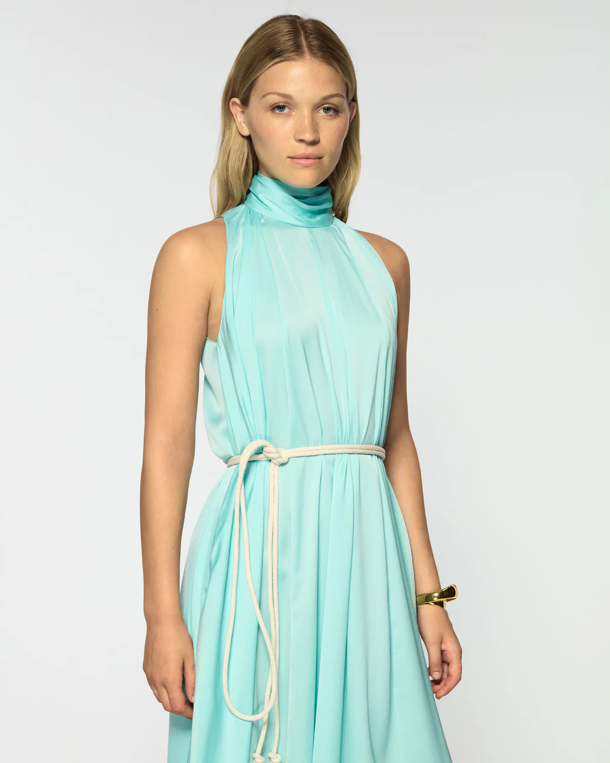Our Draped Full Length Dress creates a graceful, flowing silhouette from neckline to hem. Designed with a high neck and double-layered fabric, it moves elegantly and flatters the body. An included rope tie belt can be worn to gather the waist or left loose for a relaxed, dramatic shape.