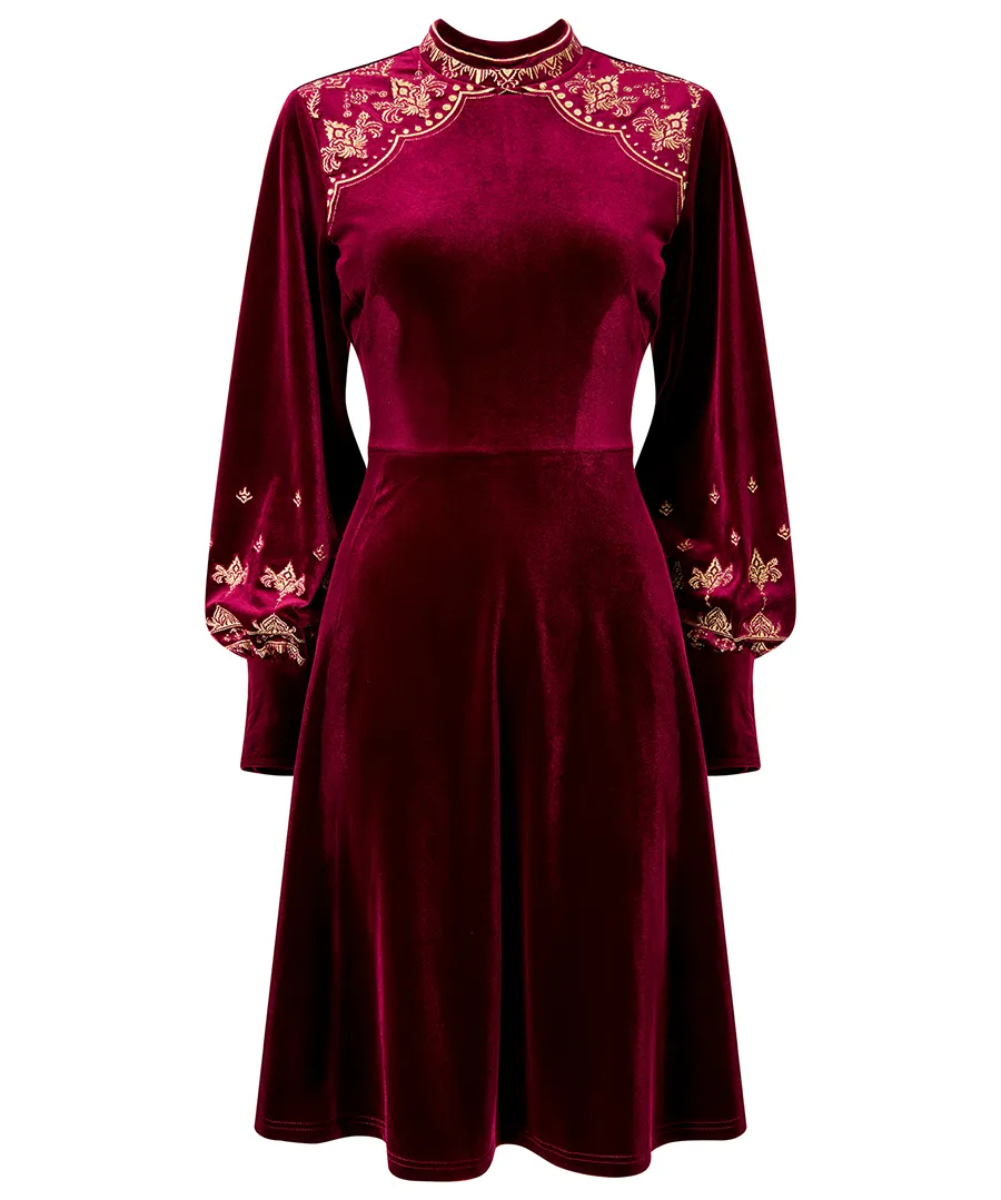Mixing velour fabric and gold embroidery, this exquisite dress is our boutique boho wonder!