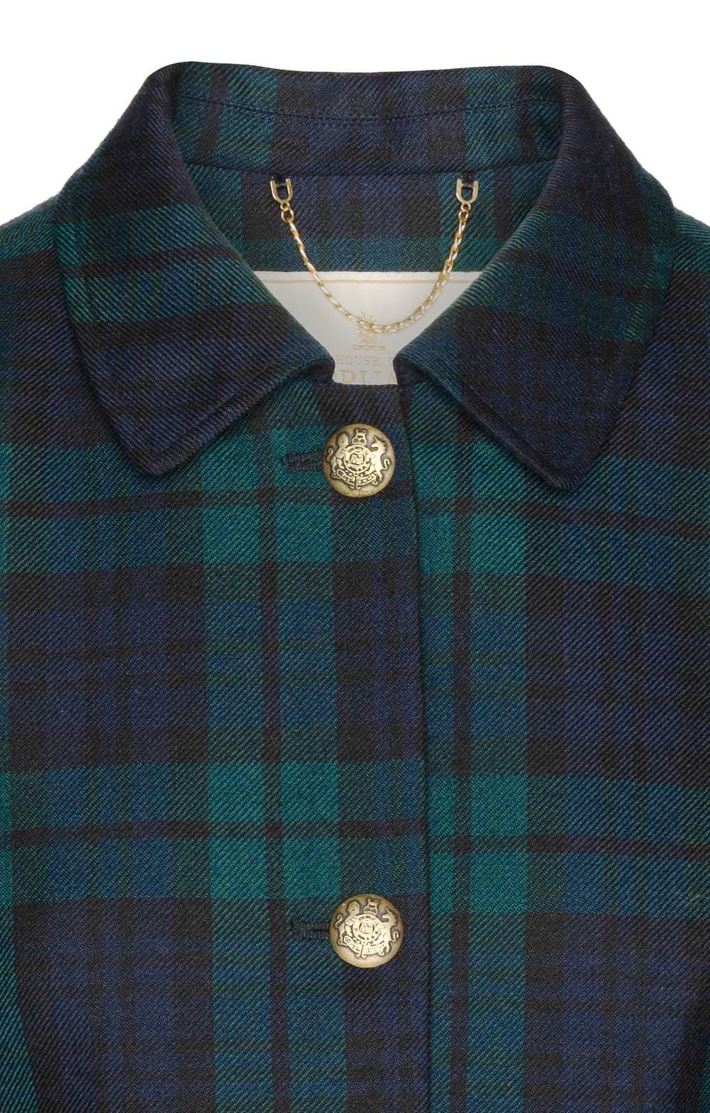 Cut in the style of a classic car coat but with a modern twist courtesy of its eye-catching patch pockets, this flattering cropped jacket is a smart and elegant piece. British-woven pure wool heritage tartan looks resplendent in this design, displaying a passion for Scotland in a wonderfully stylish way. Featuring a high collar, eye-catching flap pockets, and ornate de-bossed metallic buttons with horizontal loops.