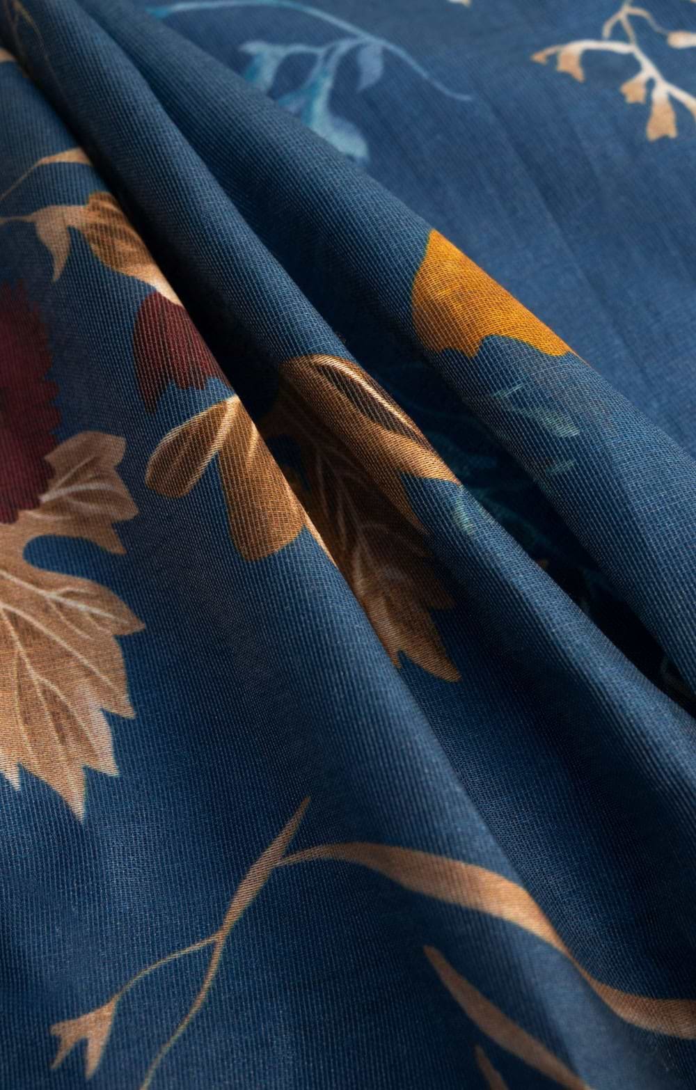 Crafted from a lightweight, semi-sheer fabric with a soft inner lining, this dress drapes beautifully and moves fluidly with every step. The delicate floral print in autumnal tones contrasts perfectly against the backdrop, while the wrap-style bodice flatters the figure and ties neatly at the waist for a defined, feminine shape. Finished with gently gathered three-quarter sleeves and a softly flared skirt, it’s an easy-to-wear piece that transitions seamlessly from day to evening.