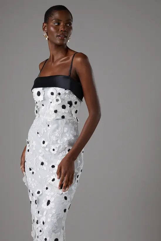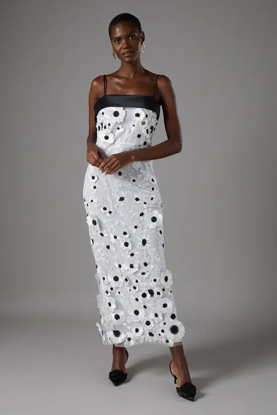Make a striking impression at your next special occasion with this exquisite Coast midi dress. The intricate 3D floral lace creates a captivating textural dimension that catches the light beautifully as you move. The contrast band at the neckline adds a contemporary touch to this sophisticated silhouette, whilst the elegant strappy design showcases your décolletage to perfection. Style with minimal jewellery to let the dress command attention – a pair of statement earrings as seen on our model would complement without overwhelming. Perfect for race day events, summer weddings or garden parties, this dress pairs wonderfully with sleek heels and a coordinating clutch. The back split offers both comfort and a subtle glimpse of leg, ensuring you remain poised and elegant throughout your event.