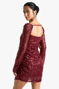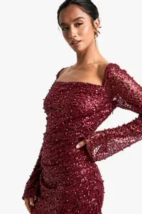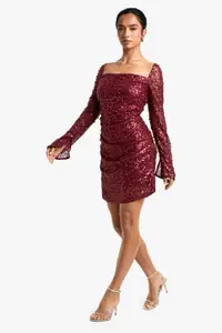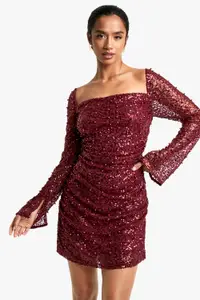 Make a show-stopping entrance at your next festive celebration with this captivating petite sequin mini dress from Boohoo. The all-over sequin embellishment catches the light beautifully, ensuring you’ll shine throughout the night. Its square neckline adds a touch of sophistication, while the long sleeves with flared cuffs offer a dramatic flair. The figure-hugging silhouette, enhanced by ruched detailing, creates a flattering and sculpted look. Perfect for Christmas parties or New Year’s Eve bashes, this dress pairs wonderfully with strappy heels and statement earrings, as seen on the model. For a more relaxed yet equally stylish ensemble, team it with ankle boots and a faux fur jacket. This versatile piece allows you to customise your look, making it ideal for various festive occasions throughout the season.