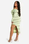 Embrace your curves in this striking Bardot strickkleid, perfect for the fashion-forward woman who loves to make a statement. The off-shoulder design with its charming ruffle detail adds a touch of flirty femininity, while the form-fitting silhouette accentuates your shape beautifully. Ideal for transitioning from day to night, this dress can be styled for various occasions. For a chic daytime look, pair it with white trainers and a crossbody bag. When the sun sets, elevate your ensemble with strappy heels and statement earrings for a night out on the town. The side slit adds a dash of drama, allowing for ease of movement whether you’re heading to the office or dancing the night away. This versatile piece is a must-have for the Boohoo girl who demands fashion that keeps up with her vibrant lifestyle.