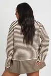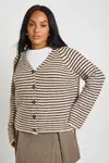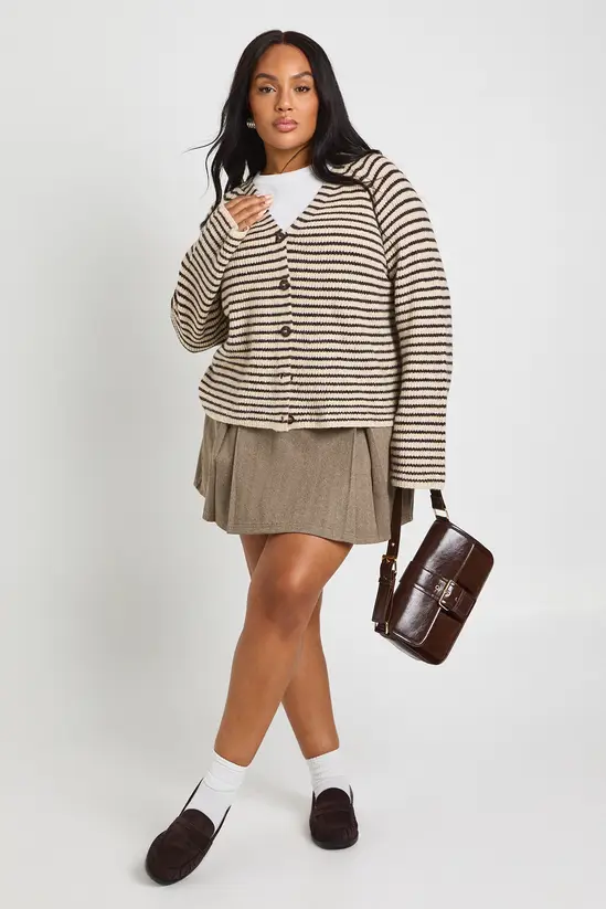 This super soft V-neck stripe knitted boyfriend cardigan is the perfect addition to your casual wardrobe. The relaxed silhouette offers both comfort and style, making it an essential layering piece for your everyday looks. Style it as shown with a simple white tee and mini skirt for a preppy-inspired ensemble that works brilliantly for university lectures or weekend brunches with the girls. The cropped length sits perfectly with high-waisted bottoms, while the classic button-through design allows for versatile styling options. Pair with loafers and ankle socks for a trendy academic aesthetic, or throw over a casual dress with trainers for family gatherings. This Boohoo cardigan transitions effortlessly between seasons – layer under a trench coat when temperatures drop or wear open over a cami when the weather warms up. A true wardrobe staple that combines comfort with on-trend style.