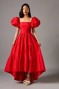 Puff Sleeve Tiered High Low Maxi Dress