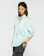 Our Paris Shirt has a relaxed cut, designed with a longer back hem, it brings fluid movement and an effortless drape, whether worn loose or tucked. Less fitted than the Serena Shirt, the fabric flow naturally around the body for a look that’s both refined and relaxed.
