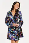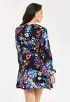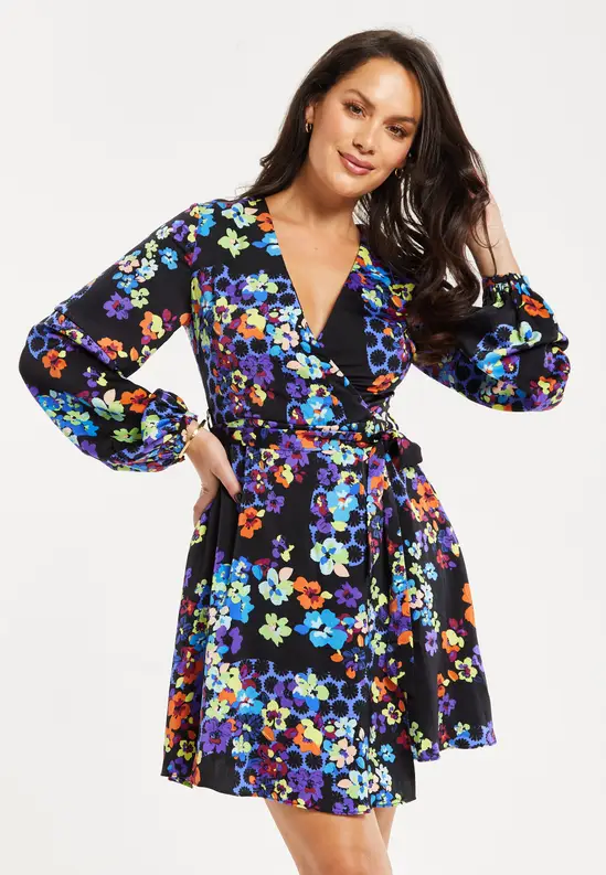 This floral print mini dress is perfect for Autumn/Winter, with hues of orange and blue, it has the perfect colour palette for both seasons. Pair with some knee-high boots and statement earrings for a impactful look or heels and a clutch for a stylish elegant look. Featuring long balloon sleeves and a wrap appearance skirt that is stitched closed with a satin tie belt. The Speckle Floral Print includes 2 layers, a colourful floral paint style print on top with a blue and black abstract floral print underneath. • All over speckle floral print• Satin shimmer fabric• Wrap around appearance stitched in place• Satin ribbon waist belt• Mini length• V-neck• Long length balloon style sleeves• Button cuff Fabric composition: 100% Polyester