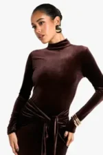 Make a striking entrance at your next festive celebration with this sumptuous velvet maxi dress. The high neck and long sleeves create a sleek, sophisticated silhouette, while the figure-hugging design showcases your curves beautifully. The tie belt allows you to cinch in your waist for a flattering, customised fit. Perfect for Christmas parties or as a show-stopping Christmas Day outfit, this dress exudes elegance and charm. Style with strappy metallic heels and statement earrings for a glamorous evening look, or dress it down with ankle boots and a faux fur jacket for a more casual yet chic ensemble. The versatile design ensures this dress will become a go-to piece for various special occasions throughout the winter season.