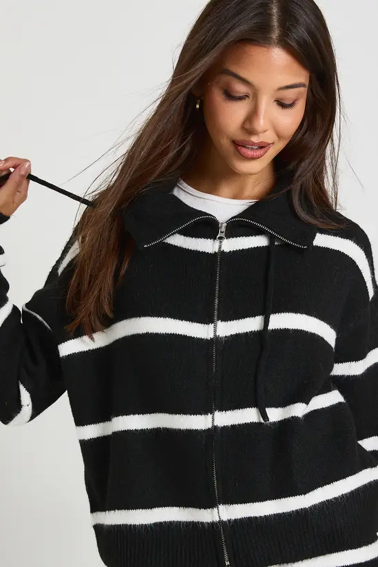 This eye-catching zip-through jumper combines contemporary style with everyday comfort. The statement stripe pattern adds a modern twist to your casual wardrobe, while the practical full-zip design allows for versatile styling options. Layer over a simple t-shirt as seen on the model for a relaxed daytime look, or wear zipped up as a standalone piece. Perfect for family gatherings, weekend brunches or casual coffee dates, this jumper pairs beautifully with your favourite jeans and trainers for an effortlessly cool vibe. For cooler days, style under an oversized coat with ankle boots and a crossbody bag. The adaptable design transitions seamlessly from autumn strolls to spring evenings, making it a wardrobe staple that works hard for your everyday rotation.